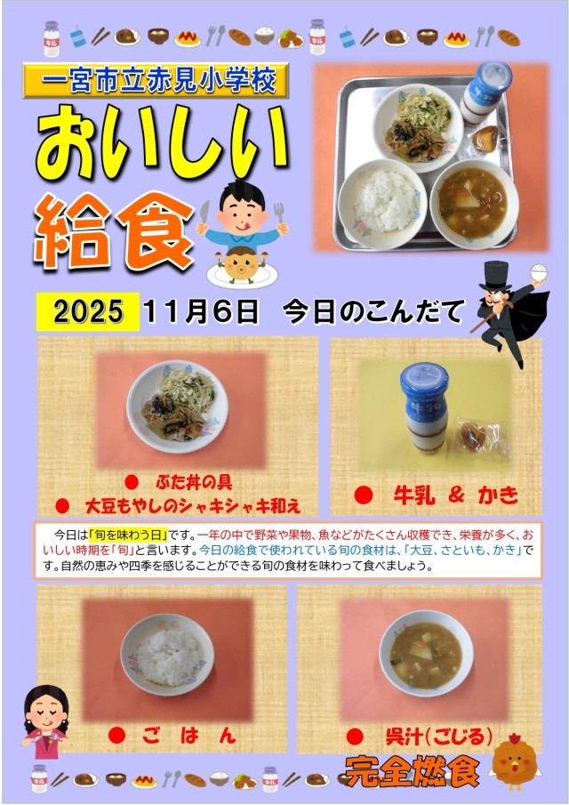 【献立あれこれ】『呉汁』『ぶた丼の具』『大豆もやしのシャキシャキ和え』『柿(かき)』今日は「旬を味わう日」です。一年の中で野菜や果物、魚などがたくさん収穫でき、栄養が多く、おいしい時期を「旬」と言いま...