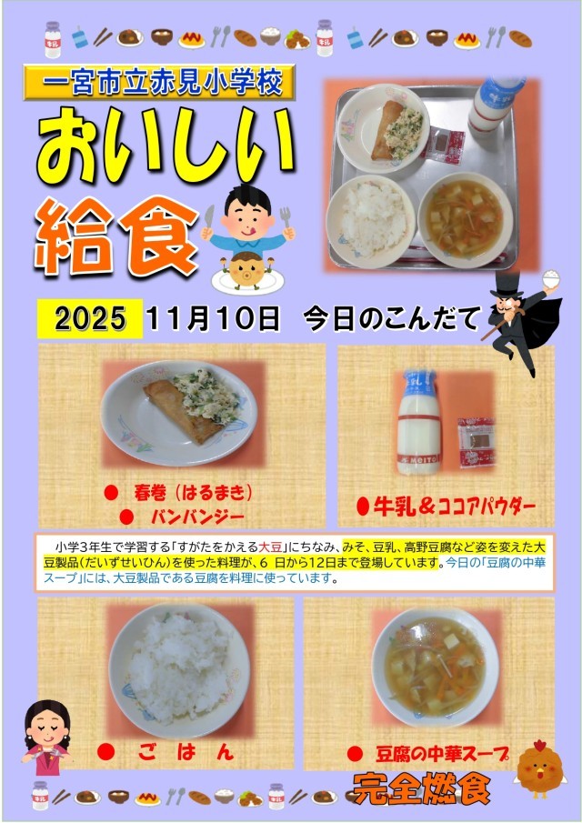 【献立あれこれ】『豆腐の中華スープ』『春巻』『バンバンジー』小学3年生で学習する「すがたをかえる大豆」にちなみ、みそ、豆乳、高野豆腐など姿を変えた大豆製品(だいずせいひん)を使った料理が、6日から12...