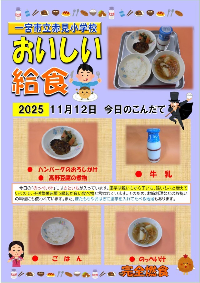 【献立あれこれ】『のっぺい汁』『ハンバーグのおろしがけ』『高野豆腐の煮物』今日の「のっぺい汁」にはさといもが入っています。里芋は親いもから子いも、孫いもへと増えていくので、子孫繁栄を願う縁起が良い食べ...