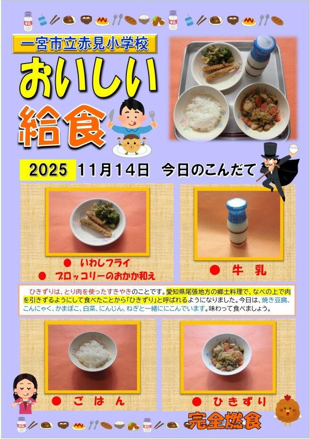 【献立あれこれ】『ひきずり』『いわしフライ』『ブロッコリーのおかか和え』ひきずりは、とり肉を使ったすきやきのことです。愛知県尾張地方の郷土料理で、なべの上で肉を引きずるようにして食べたことから「ひきず...