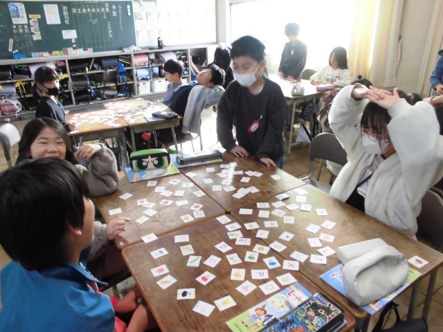今日は英語の授業がありました。これまでに学習した英語単語のカードを使って、かるたをしました。ALTの先生が読む英単語をよく聞いて、その単語の書いてあるイラストの絵を取ることができました。楽しみながら...
