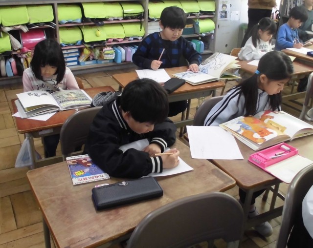 国語の時間に、昔話を読みました。いろいろな昔話を読んで、登場人物や思ったことをカードに書きました。1冊読み終わると次の本を探して、次々に読んでいきました。今後は、読んだ本の中から気に入ったお話を選ん...