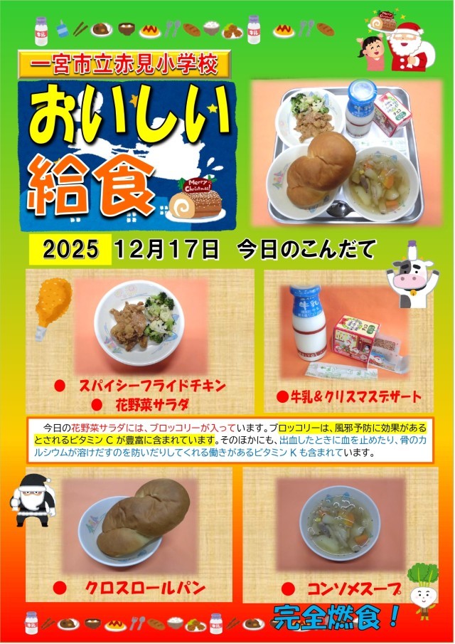 【献立あれこれ】『コンソメスープ』『スパイシーフライドチキン』『花野菜サラダ』『クリスマスデザート』今日の花野菜サラダには、ブロッコリーが入っています。ブロッコリーは、風邪予防に効果があるとされるビタ...