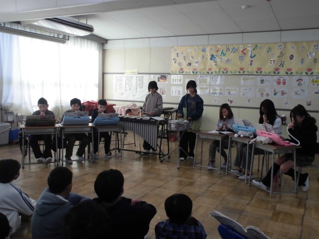 音楽のまとめの学習として、「love」という曲の演奏会をしました。5つのパートに分かれ、それぞれ適した楽器を選んでグループごとに練習してきました。とても上手に演奏することができました。