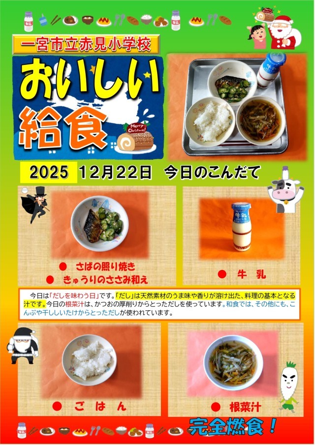 【献立あれこれ】『根菜汁』『さばの照り焼き』『きゅうりのささみ和え』今日は「だしを味わう日」です。「だし」は天然素材のうま味や香りが溶け出た、料理の基本となる汁です。今日の根菜汁は、かつおの厚削りから...