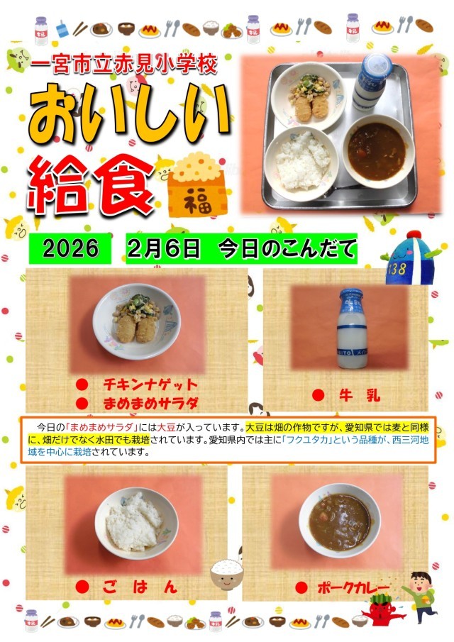 【献立あれこれ】『ポークカレー』『チキンナゲット』『まめまめサラダ』今日の「まめまめサラダ」には大豆が入っています。大豆は畑の作物ですが、愛知県では麦と同様に、畑だけでなく水田でも栽培されています。愛...