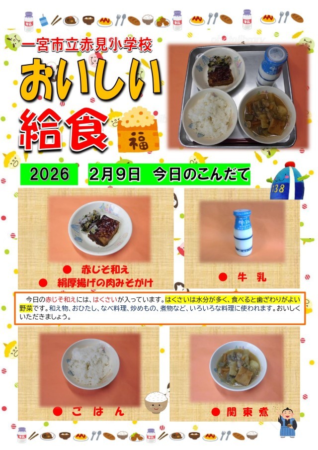 【献立あれこれ】『関東煮』『赤じそ和え』『絹厚揚げの肉みそがけ』今日の赤じそ和えには、はくさいが入っています。はくさいは水分が多く、食べると歯ざわりがよい野菜です。和え物、おひたし、なべ料理、炒めもの...
