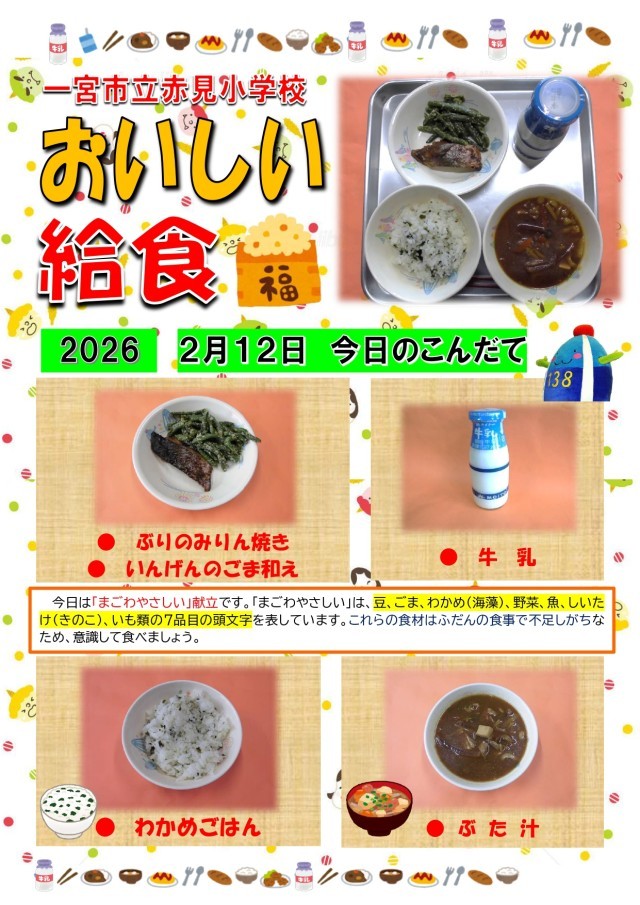 【献立あれこれ】『ぶた汁』『ぶりのみりん焼き』『いんげんのごま和え』今日は「まごわやさしい」献立です。「まごわやさしい」は、豆、ごま、わかめ(海藻)、野菜、魚、しいたけ(きのこ)、いも類の7品目の頭文...