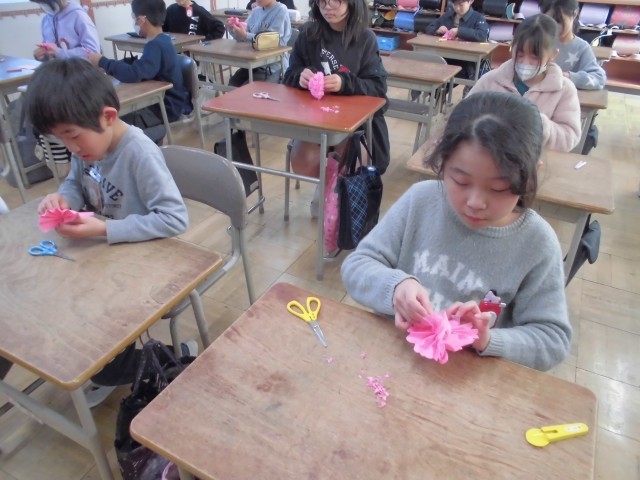 来年度、赤見小学校に入学してくる新1年生の子たちが、入学式で胸につけるお花を4年生に作ってもらいました。4月に新しい仲間に会えるのが楽しみです。