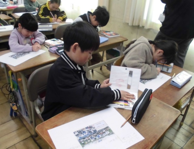 国語の時間に作っている「作文つづり」の中に入れるための寄せ書きを書きました。みんなの写真の周りに自分の名前を書きました。今まで、がんばって1年生の思い出を作文に書いてきたので、次は、作文や寄せ書きをま...