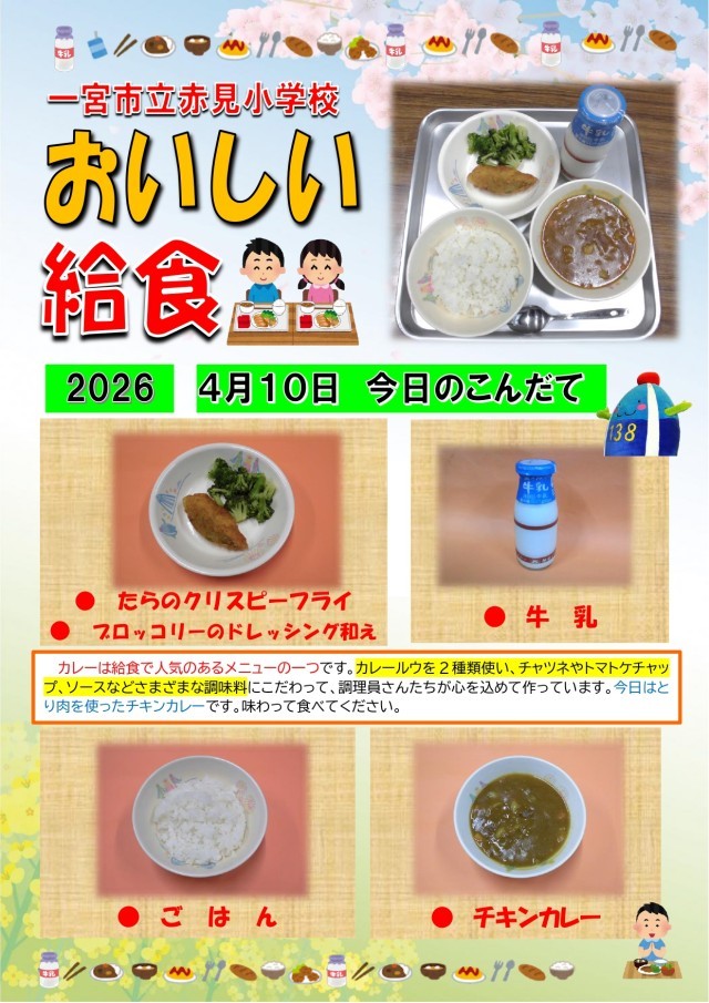 【献立あれこれ】 『チキンカレー』『たらのクリスピーフライ』『ブロッコリーのドレッシング和え』カレーは給食で人気のあるメニューの一つです。カレールウを2種類使い、チャツネやトマトケチャップ、ソースなど...