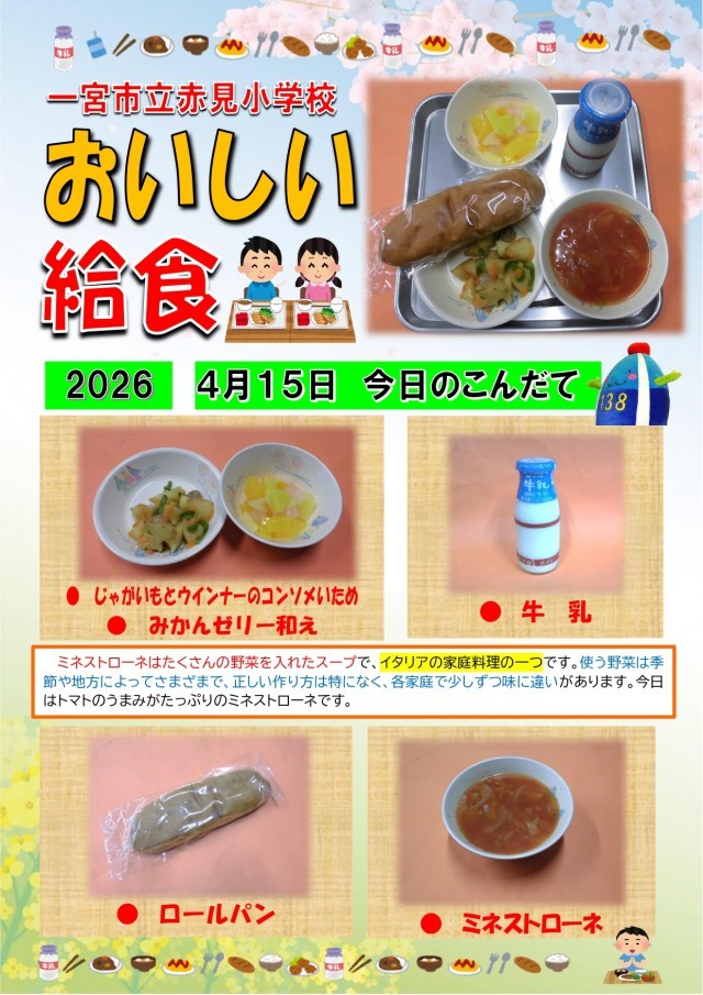 【献立あれこれ】『ミネストローネ』『じゃがいもとウインナーのコンソメいため』『みかんゼリー和え』ミネストローネはたくさんの野菜を入れたスープで、イタリアの家庭料理の一つです。使う野菜は季節や地方によっ...