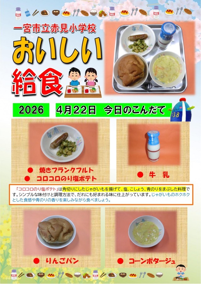 【献立あれこれ】『コーンポタージュ』『焼きフランクフルト』『コロコロのり塩ポテト』「コロコロのり塩ポテト」は角切りにしたじゃがいもを揚げて、塩、こしょう、青のりをまぶした料理です。シンプルな味付けと調...