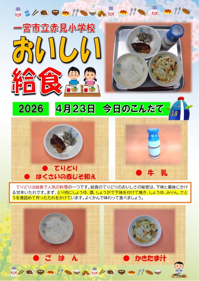 【献立あれこれ】『かきたま汁』『てりどり』『はくさいの赤じそ和え』てりどりは給食で人気の料理の一つです。給食のてりどりのおいしさの秘密は、下味と最後にかける甘辛いたれです。まず、とり肉にしょうゆ、酒、...