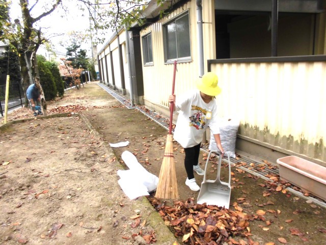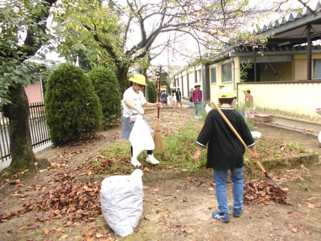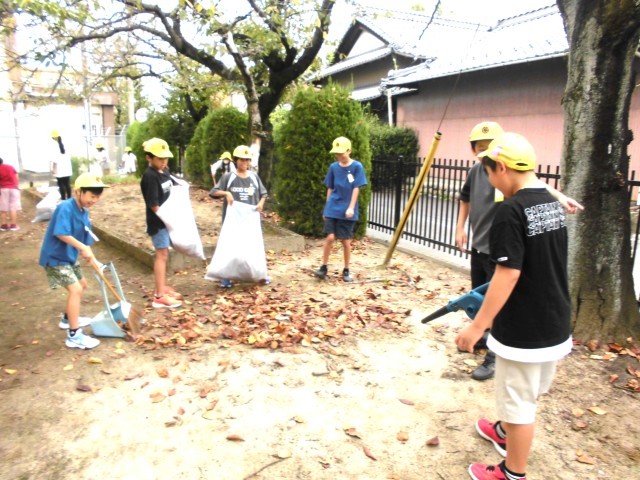理科の授業で、ツルレイシとサクラの木の観察をしました。サクラの木の葉は、枯れてたくさん落ちていました。そこで、熊手や竹ぼうきを使って、みんなで9袋も落ち葉を集めました。