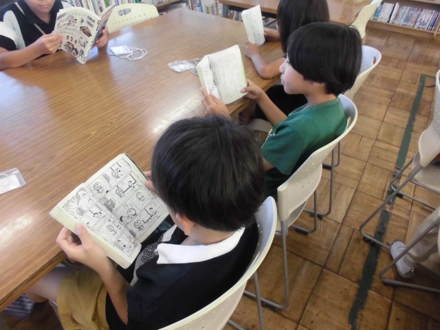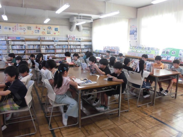 朝学の時間に、図書館で本を借りました。どの子も日々読書を楽しんでいます。読書をする習慣を身に付けて、様々な学習にいかしてほしいです。