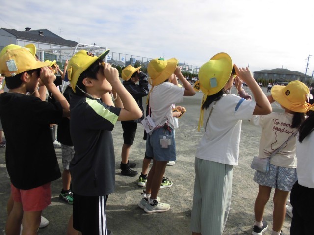 理科では、かげについて学習しています。今日は、しゃ光板を使って、かげと太陽の位置を観察しました。「太陽と反対の位置にかげができてる!」「あれ、太陽の位置が少しかわった?」と、いろんなことに注目しながら観察することができました。