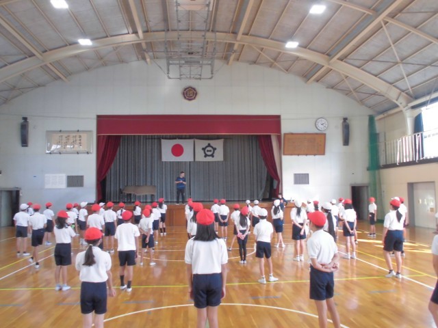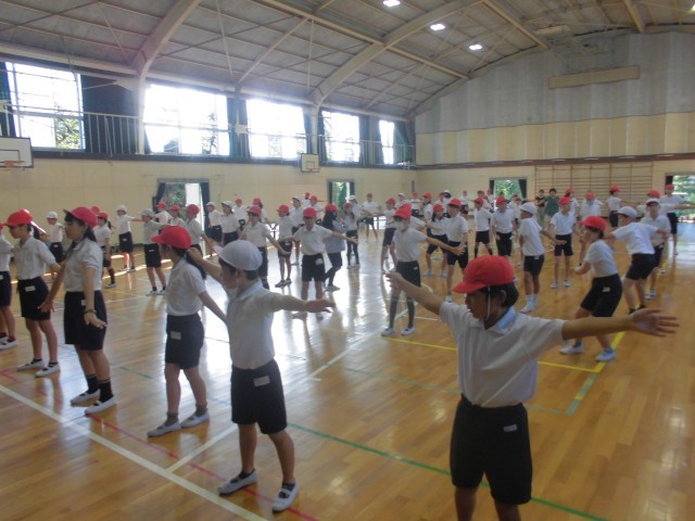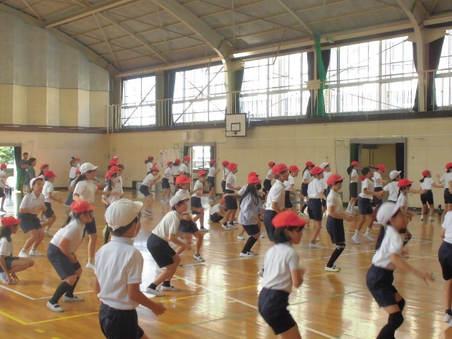 5・6時間目は、屋内運動場でダンスの振り付けを覚えました。指先や足先までピンとのばしたり、腕の高さに気を付けたりしながら学年みんなで踊りました。
