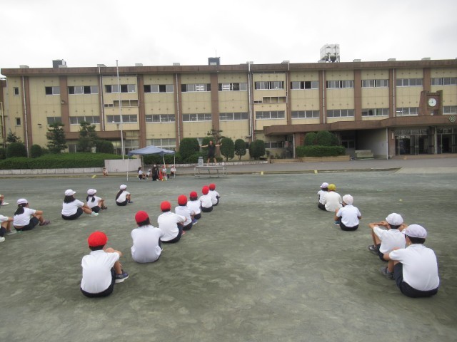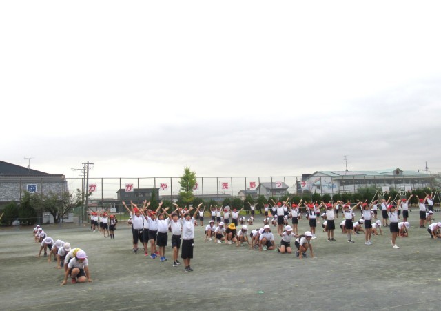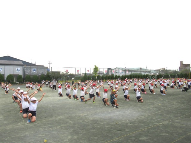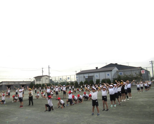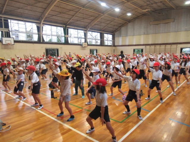 先週はソーラン節を最初から退場まで通して練習しましたが、今日はソーラン節の前に踊る曲の練習をしました。単純な振りですが、みんなで揃えのが難しいです。揃うと格好いいです。先生のカウントを聞きながら、一生懸命練習をしました。雨が降ってきたので、体育館に入って練習もしました。
