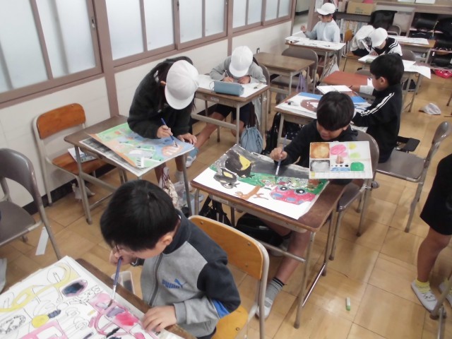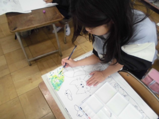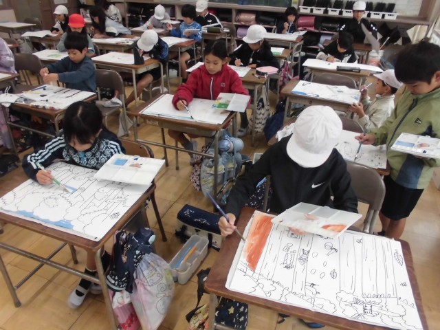 図工の授業では、読書感想画を描いています。お話の内容を聞いて、自由に想像しながら絵を描いています。今日は、絵の具を使って、細かいところも丁寧に色を塗ることができました。混色を楽しむ様子も見られました。