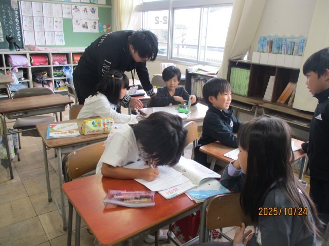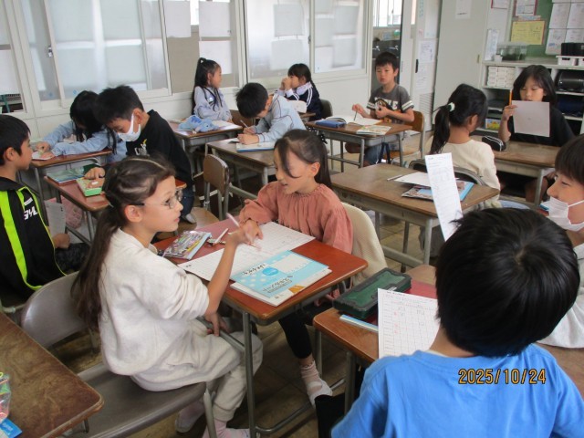 算数では、「かけ算」を勉強しています。みんなの楽しみは九九の練習。便利に使える九九を元気よく唱えながら覚えています。「九九チェックカード」も使って、友達と確かめ合っています。九九を「じゅんに」「ぎゃくに」「ばらばらに」唱え、どの段もスラスラ言えるように頑張っています。