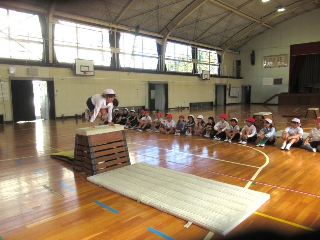 久しぶりのマットの授業。今日はかかえこみ跳びの練習をしました。手をつく位置を広めにすることや、跳び箱とロイター板の間を少し開けることを意識しながら練習をしていました。