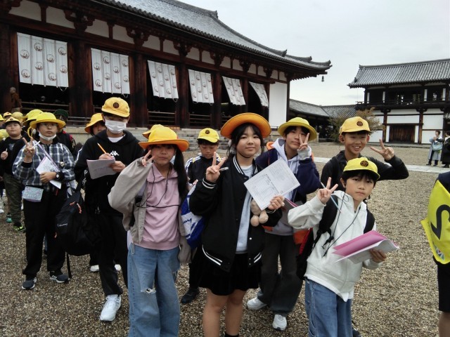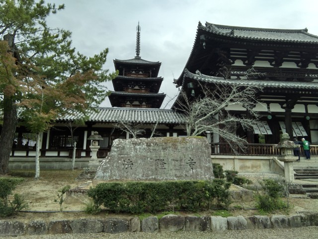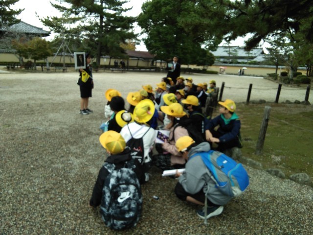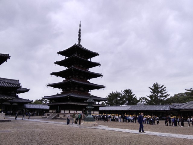 法隆寺は修学旅行生でいっぱいです。子どもたちは、イヤホンを使ってガイドさんのお話を聞いています。ポツポツと雨が降ってきました。