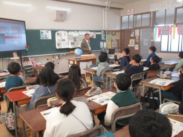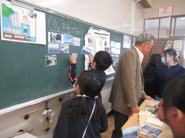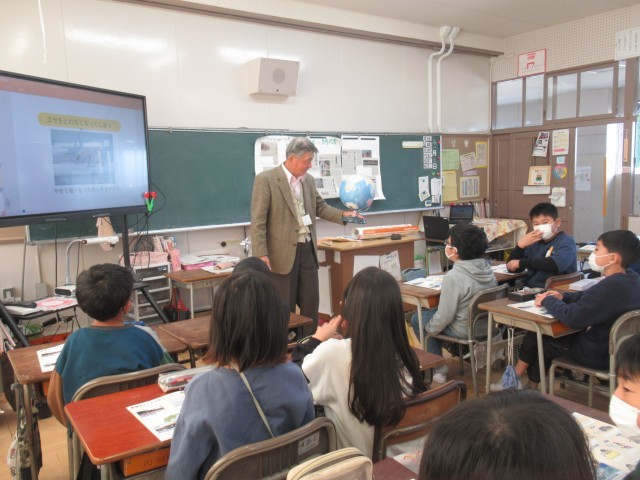 今日の公開授業では、ゲストティーチャーをお招きして、地球温暖化について学習しました。私たちがエネルギーをたくさん使うことによって、地球温暖化が起こり、洪水や海面の上昇の原因になっていることを知りました。そして、地球温暖化を止めるために、私たちにできることを考えました。