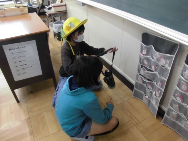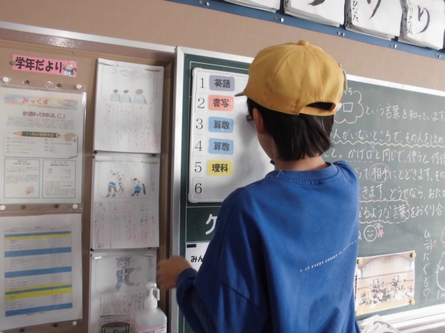 授業が終わった後、それぞれが帰る準備をします。その中で自分のことに加えて、周りを見てできることをみつけ、協力している子がたくさんいます。窓を閉める、名札が返却されているか見る、来週の予定を貼る、水筒が残っていたら友達に渡す。小さな事かもしれませんが、気づくことができてとても立派です。これからも続けてほしいです。