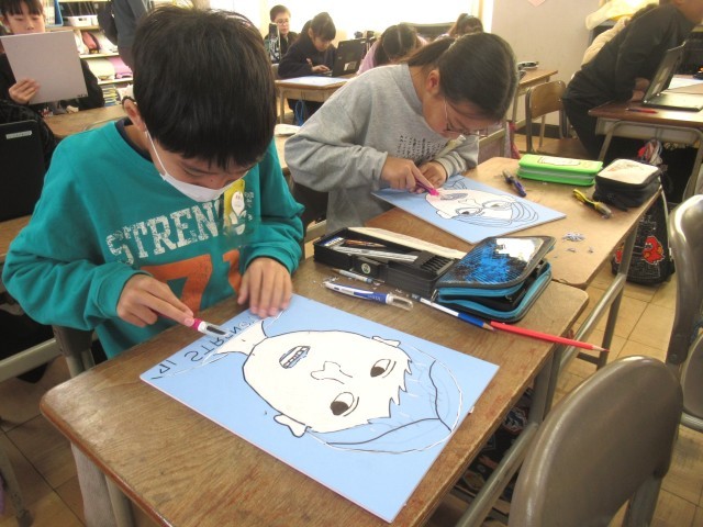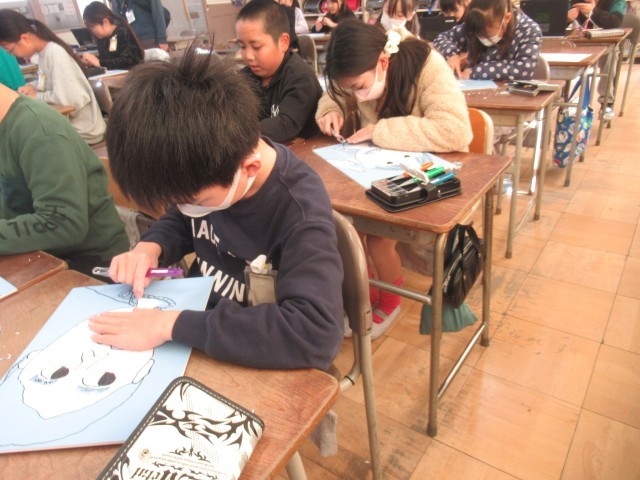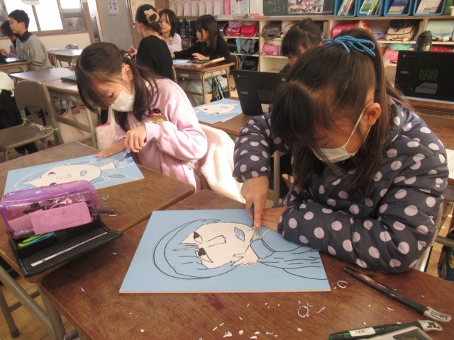 頬から彫り始めて、細かい鼻や目、歯などと順に彫り進めて、とうとう彫り終えることができました。来週は、いよいよ刷ります。どのように刷れるか楽しみですね。
