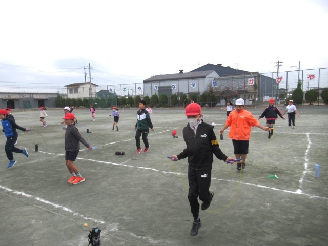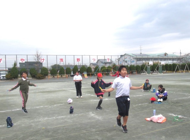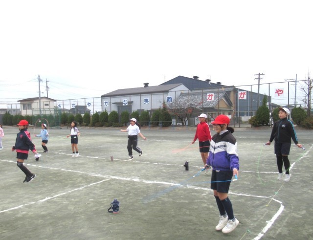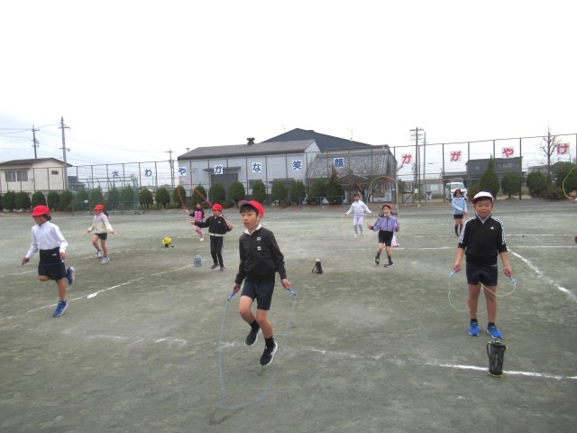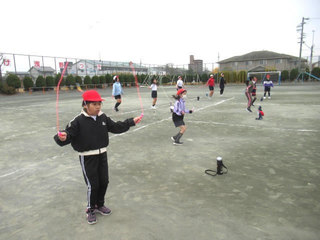 最低気温が3℃という寒空の下、体育の授業でCDをかけてリズム縄跳びの練習をしました。どの子も、新たな級の合格を目指して燃えていました。