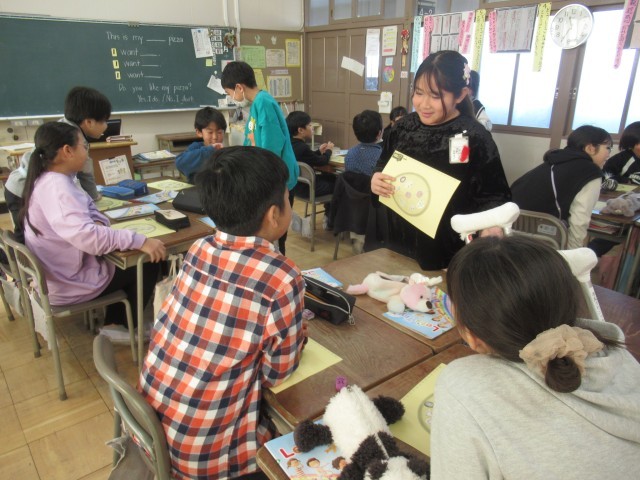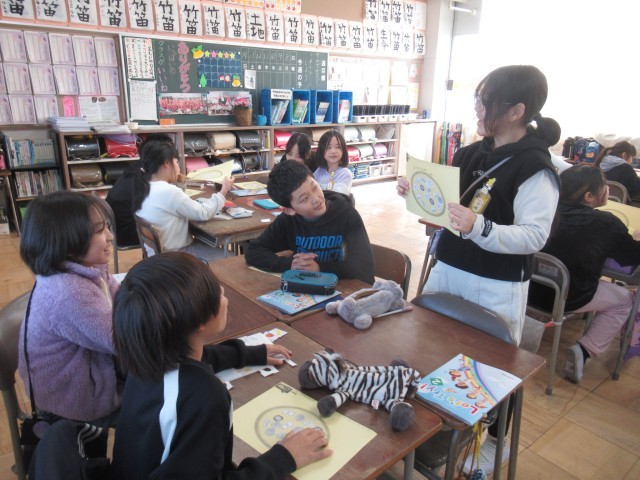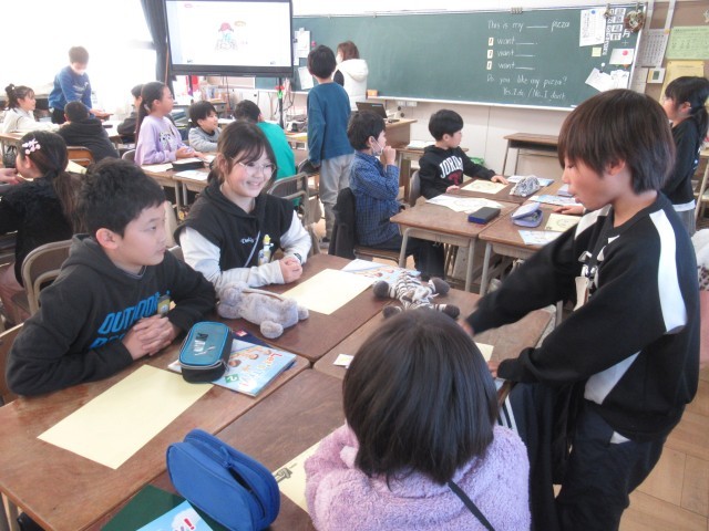 英語の時間に、お気に入りのピザを作りました。What do you want?と尋ね、マッシュルームやコーン、ポテト、トマトなどをのせていきました。