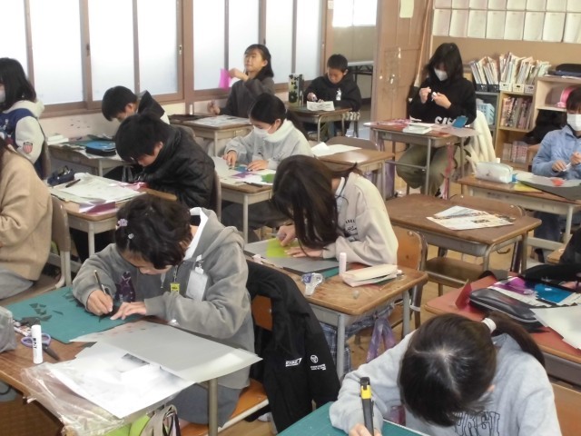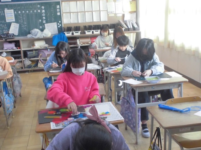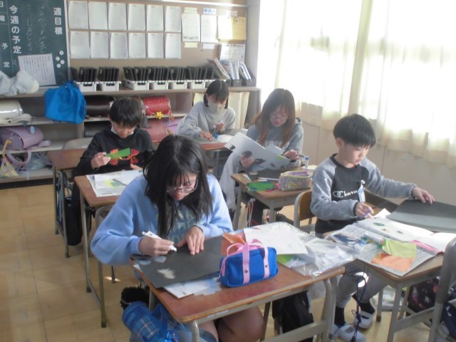 カッターで画用紙やセロファンを切り抜きランプの柄を作っています。