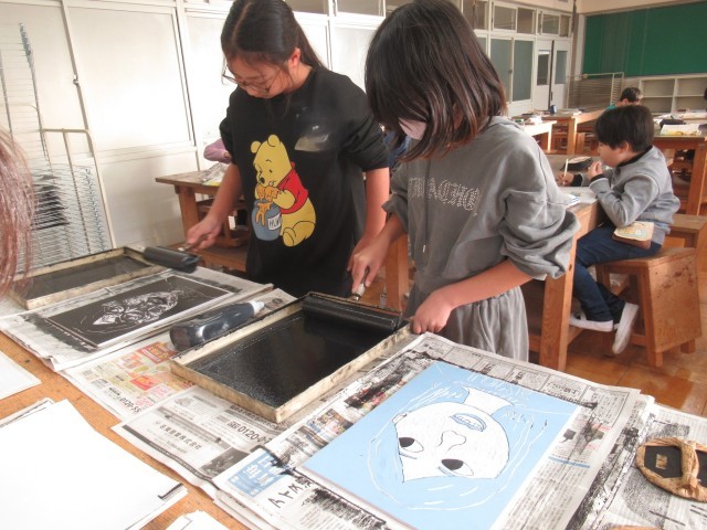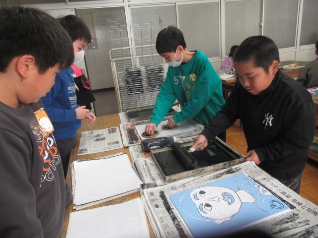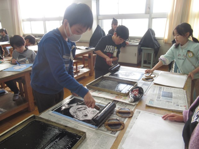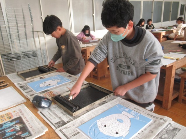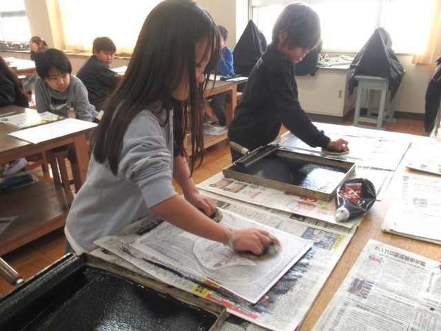 彫刻刀で丁寧に丁寧に彫ってきて、いよいよ今日は刷りました。木版にローラーでインクをつけて、バレンでこすりました。きれいに刷り上がった作品を見て、思わずにっこりする子どもたちでした。