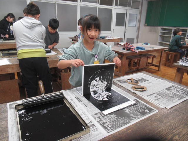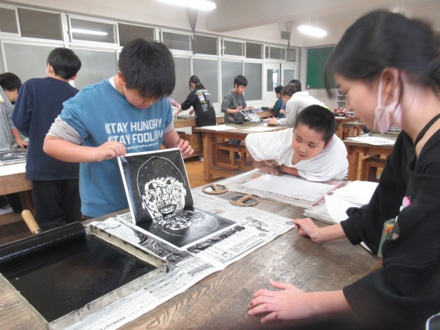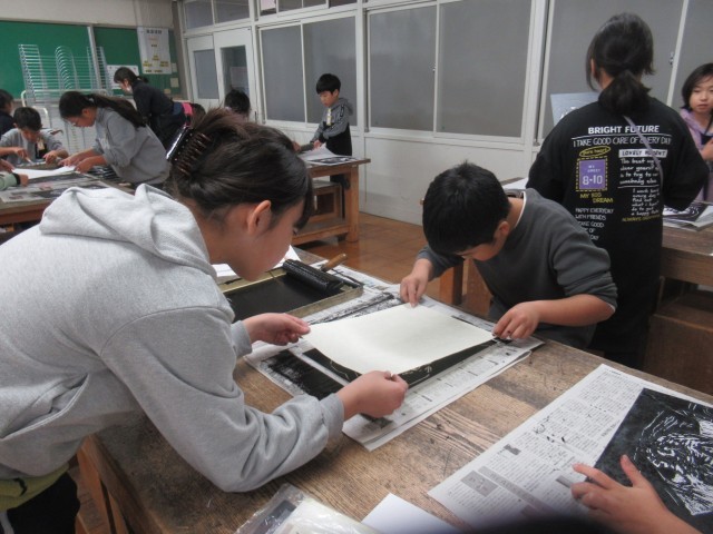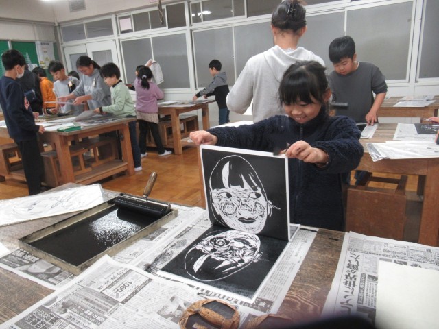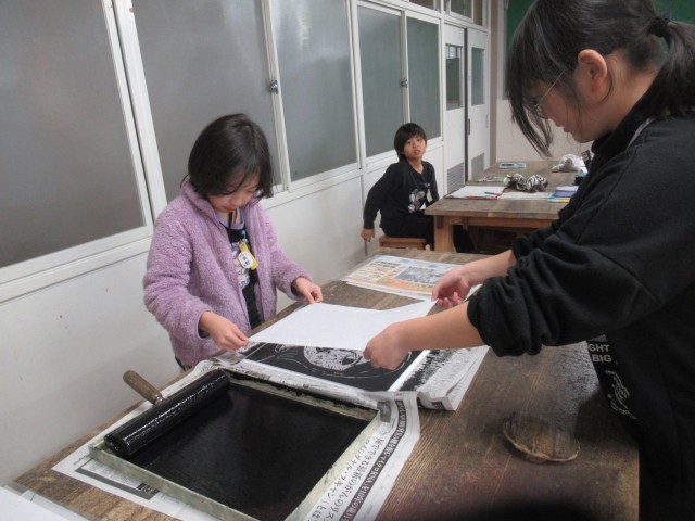 昨日に続いて今日も、版画を刷りました。きれいに刷るためのコツが分かったので、今日は協力して行いました。3学期の作品展でお家の方に見てもらえるのが楽しみですね。