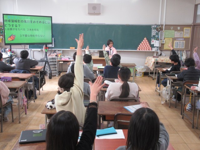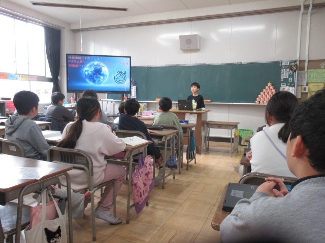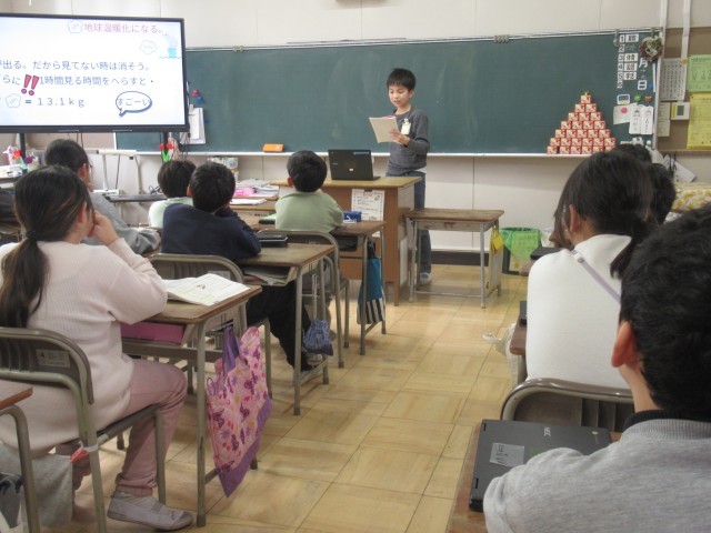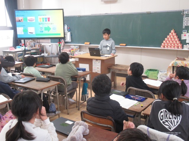 総合的な学習の時間に、環境についてまとめてきたスライドの発表会をしました。みんなに分かりやすいように工夫してスライドを作っただけあって、堂々と発表することができました。
