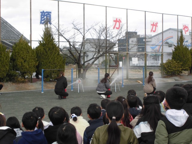 地震が原因で火災が起きた場合の避難訓練を行いました。いつもの避難訓練に加え、今日は消防署の方に来ていただき、消火器の使い方、スモークハウス体験も行いました。初めてスモークハウスに入った児童は、「何も見えなかった。」「すごい煙だった。」と話し、貴重な体験となりました。