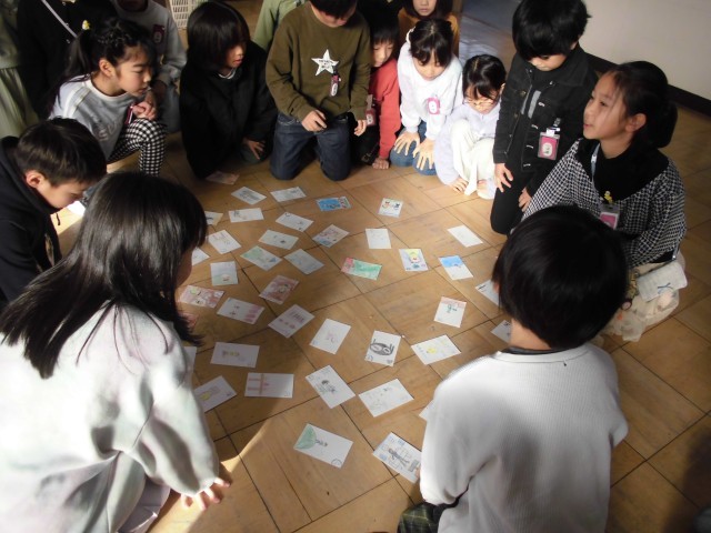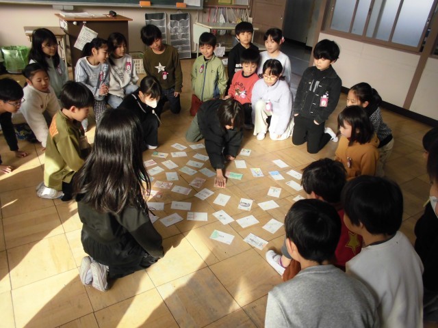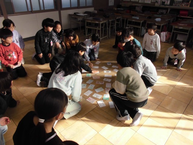 国語の授業で、漢字の音読みと訓読みを使って俳句を考え、それをカルタにして「音訓カルタ大会」を行いました。子どもたちは、「学校と学ぶが入っているから、学の札だ!」「同じ漢字を選んでいる人もいるから、絵もよく見たほうがいいよ。」と、白熱した様子でした。札をとった子に対して拍手をしたり、声をかけたりする姿を見て、朝から心が温かくなりました。