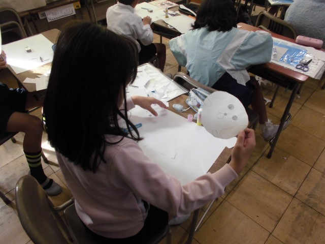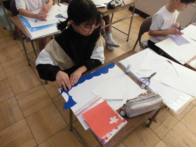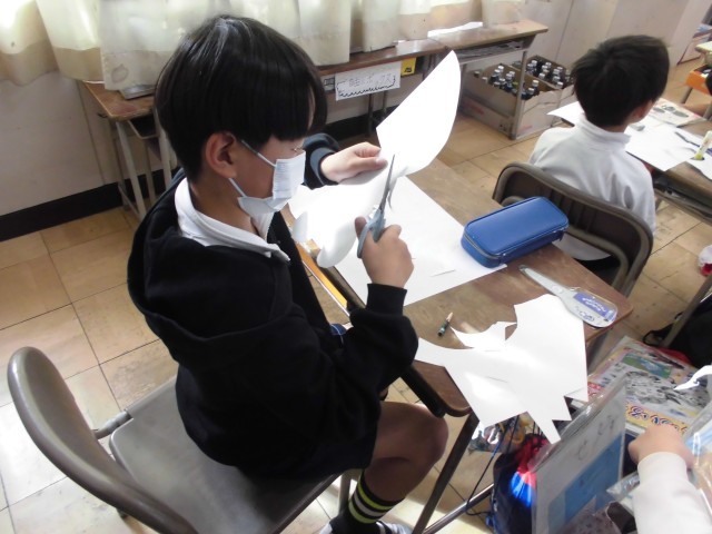 図工の授業では、紙版画を作成しています。今日は、アイデアスケッチをもとに、練習として画用紙を切りました。「もう少し大きいほうがいいかな?」と言いながら、形を調整していました。
