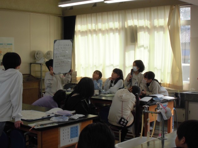 また、理科の授業では、ものの溶け方について、グループで意見をまとめて発表をしていました。教室より広い理科室の中で、みんなに見える文字、みんなに聞こえる声の大きさ、わかりやすい説明、言葉などを意識しながらみんなに伝えることができていました。