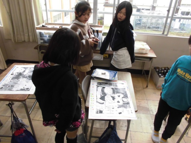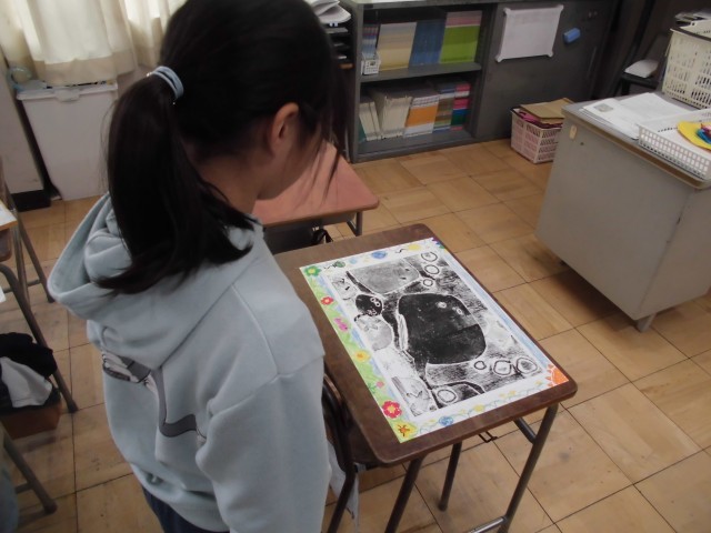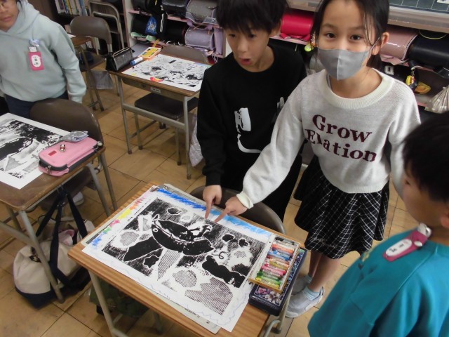 図工では、紙版画を刷った後に、画用紙に貼って鑑賞会をしました。友達の作品のよいところを見つけて、指をさしながら話し合う姿が見られました。