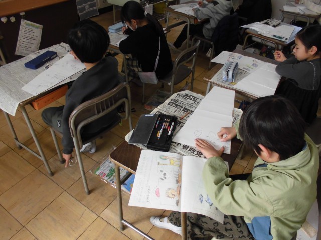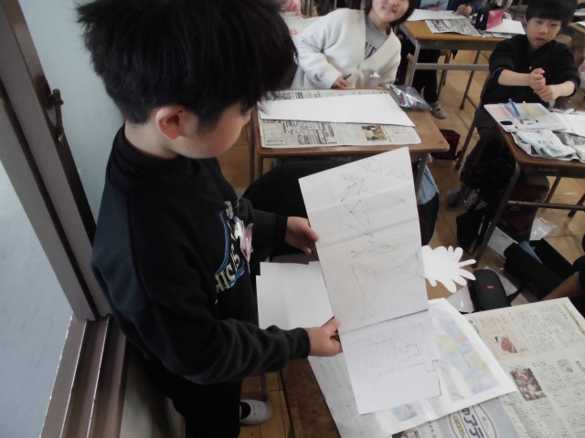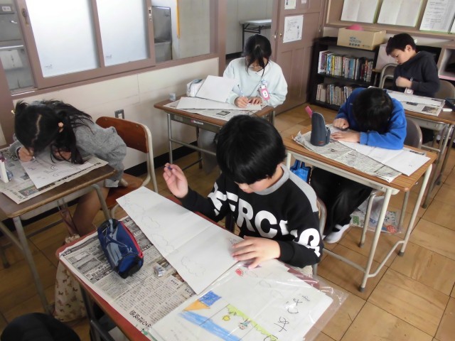 図工の授業では、段ボールの板に絵を描いて、絵を立たせる作品を作っています。今日は、段ボールに下書きをしました。どんな作品が出来上がるか、今から楽しみですね。