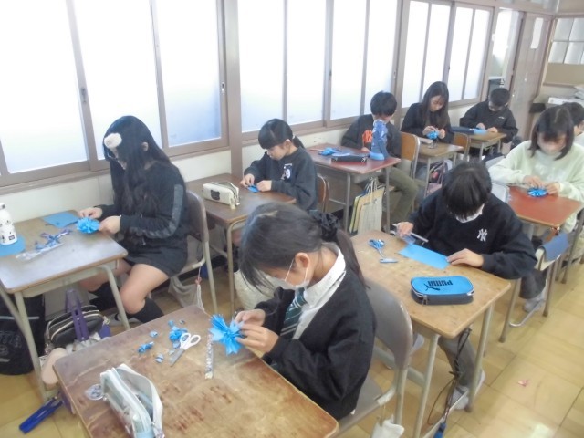 来年度入学する新1年生が、入学式で胸に付けるお花を作りました。