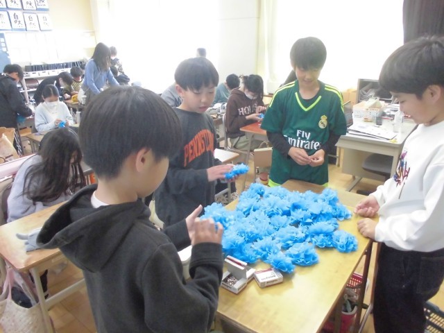 破れやすいふわふわのお花紙に苦戦しながらも、丁寧に作成をしました。