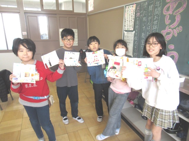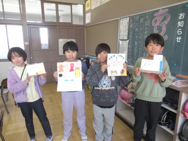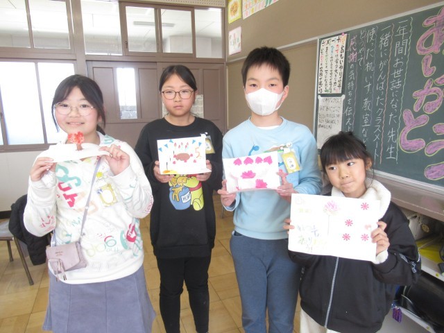 図工の時間に制作してきたカードが完成しました。家族の誕生日や兄弟姉妹の卒業・入学祝いなど、心をこめて作りました。持って帰って渡すのを楽しみにしていました。