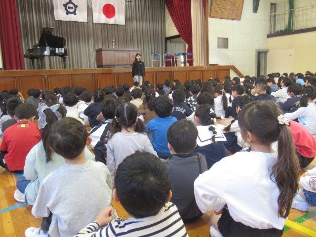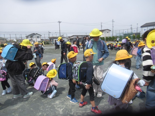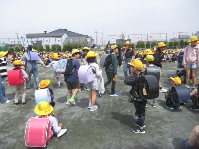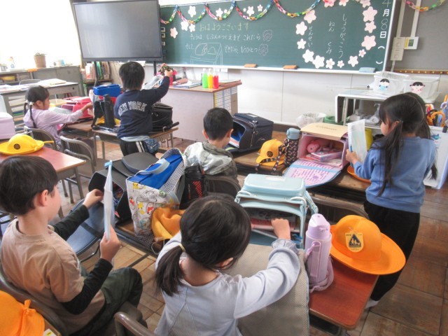 教室に着いたら、ランドセルの中のものを出して、ランドセルをロッカーに片づけることを覚えました。そして、今日は始業式と対面式がありました。帰りは、班長さんに連れにきてもらって一斉下校をしました。半日でしたが、よく頑張りました。明日は雨降りの予報ですが、元気に登校してほしいと思います。