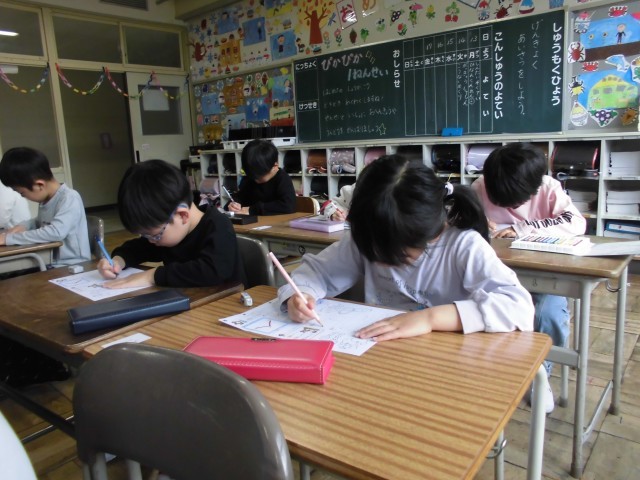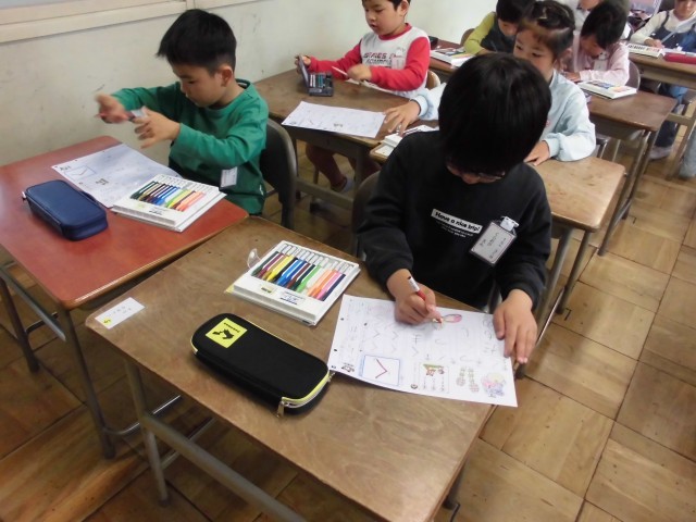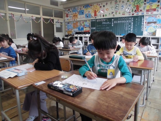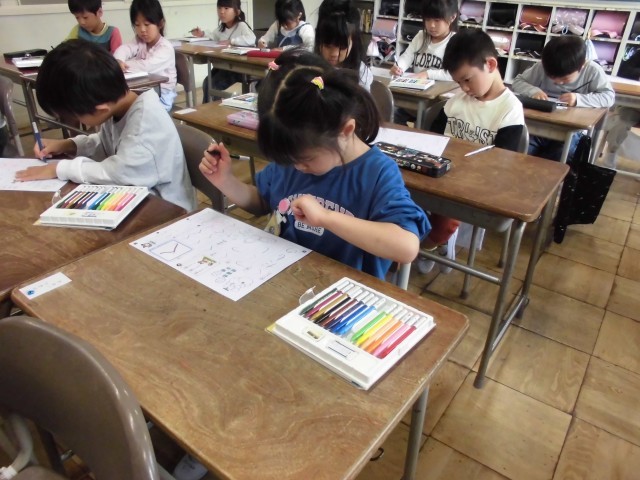 国語の時間に初めてひらがなを習いました。みんな正しい鉛筆の持ち方で丁寧に書くことができました。早く終わった子はクーピーで色塗りをして静かにしていました。来週から始まるひらがなプリントの宿題も丁寧にできるといいですね。