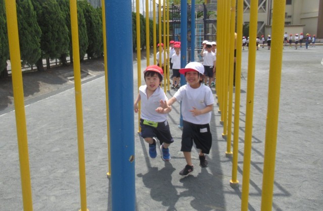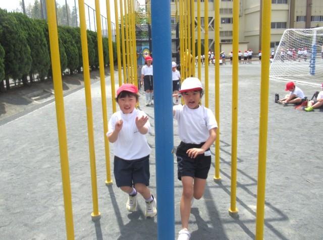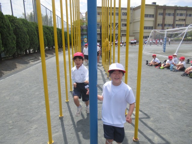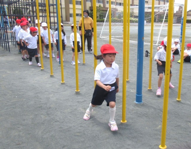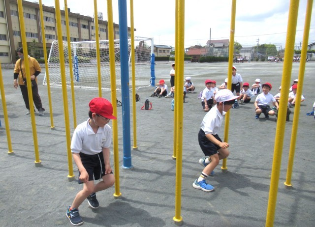 今日の体育の時間は、運動場で6年生が体力テストをしていたので、遊具を使ってジグザクに走ったり、まっすぐ走ったりする練習をしました。1年生は、24日(金)に50m走の体力テストをします。