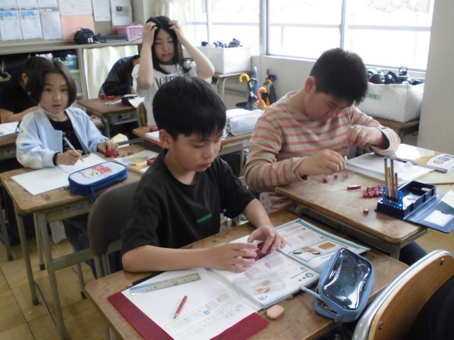 算数は体積の授業に入りました。箱のかさを比べるために、積木を使って形を作りました。新しい単位も習い、いよいよ明日からは積木なしで計算で求められるか考えます。