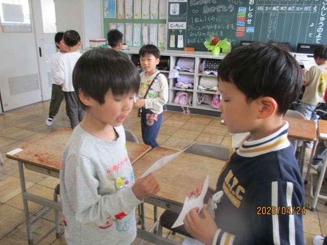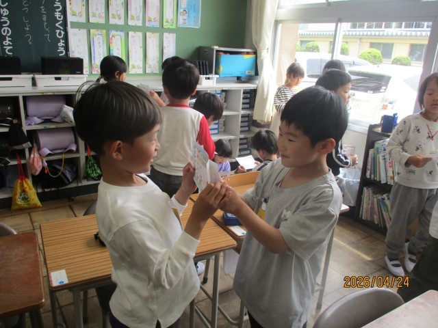 国語の学習で「どうぞよろしくのかい」をしました。名前と好きな食べ物を紹介して挨拶をしました。今まで話したことがない友達とも、お話しすることができ仲良くなることができました。
